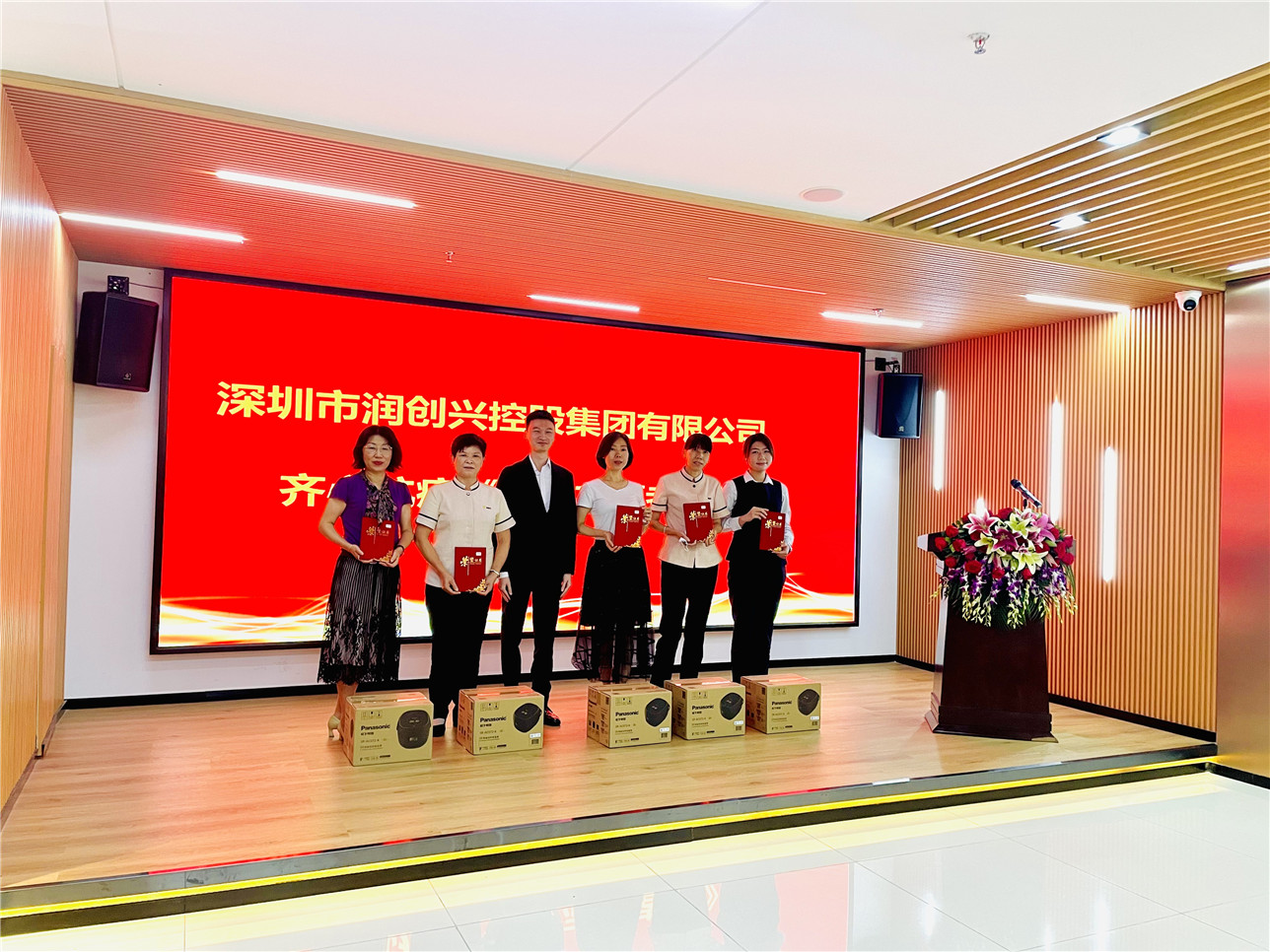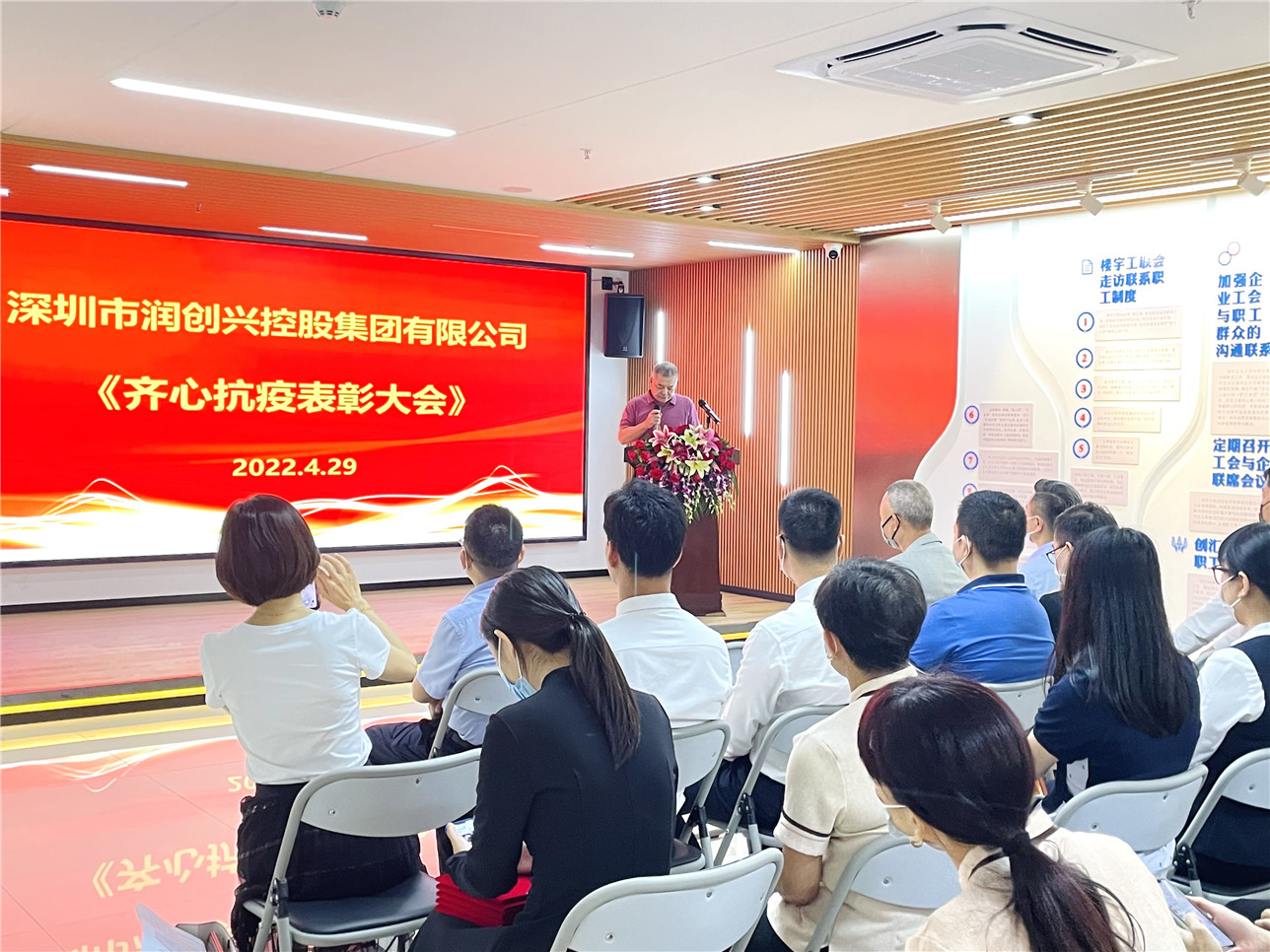 2022年4月29日下午15點(diǎn),在創(chuàng)匯國(guó)際中心21樓舉行“深圳市潤(rùn)創(chuàng)興控股集團(tuán)有限公司齊心抗疫表彰大會(huì)“。潤(rùn)創(chuàng)興集團(tuán)公司董事長(zhǎng)黃亞水、總經(jīng)理吳椰軍、副總經(jīng)理張海波、副總經(jīng)理羅勇、總助黃輝及集團(tuán)總部和下屬公司員工參加了本次表彰大會(huì)。
